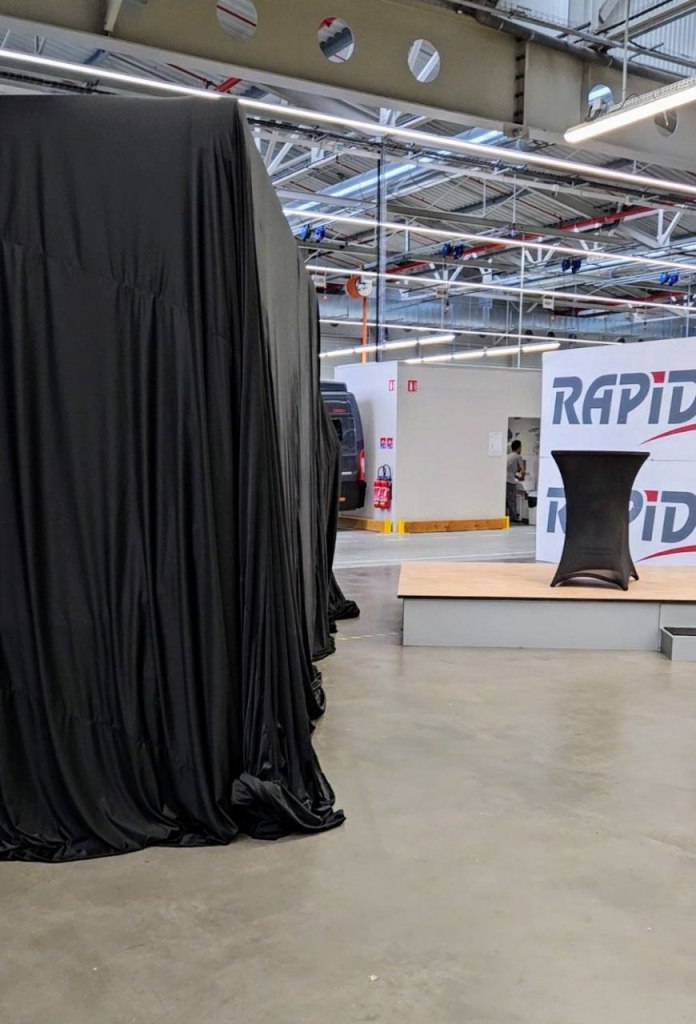 Cette masse imposante sous un voile noir au coeur des chaînes de production de l’usine Rapido à Mayenne.