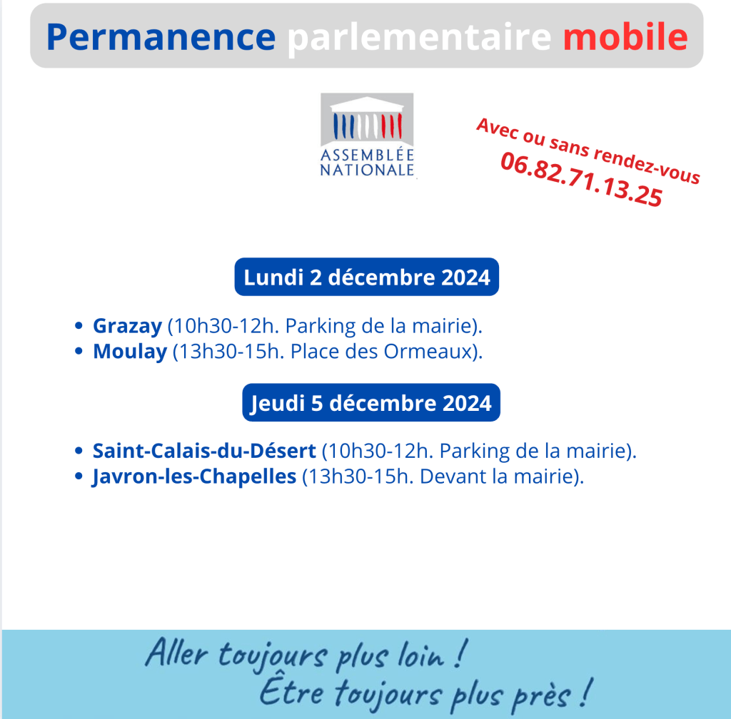 Grazay, Moulay, Saint-Calais-du-Désert et Javron-les-Chapelles sont les prochaines étapes de ma permanence parlementaire mobile. Je me réjouis de vous y accueillir, avec ou sans rendez-vous.