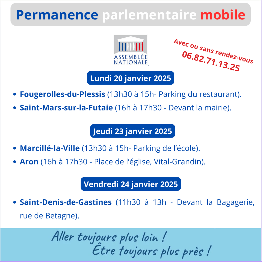 Je me réjouis de vous accueillir dans ma permanence parlementaire mobile la semaine prochaine. N’hésitez pas à venir me rencontrer à Fougerolles-du-Plessis, Saint-Mars-sur-la-Futaie, Marcillé-la-Ville, Aron ou Saint-Denis-de-Gastines.