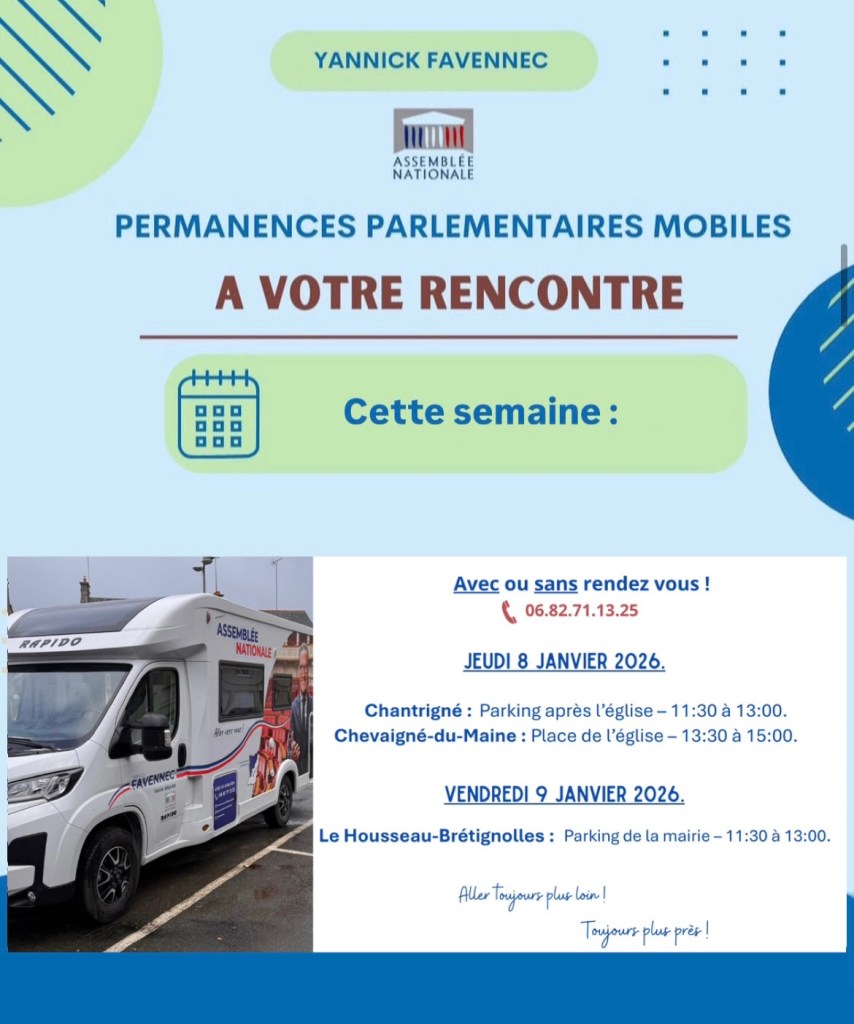 La semaine prochaine, je reprendrai les routes de la circonscription à bord de ma permanence parlementaire mobile. Après cette trêve hivernale, je viendrai à votre rencontre dans trois nouvelles communes : Chantrigné, Chevaigné-du-Maine et Le Housseau-Brétignolles.