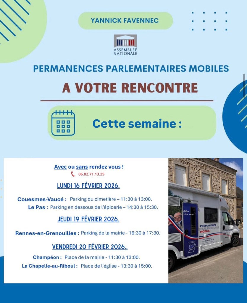 Les permanences parlementaires mobiles se poursuivent cette semaine. Je me rendrai dans cinq nouvelles communes de notre circonscription. Au programme : Couesmes-Vaucé, La Pas, Rennes-en-Grenouilles, Champéon et la Chapelle-au-Riboul.